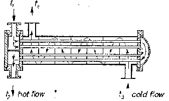 Counterflow exchanges as in Fig. 8.2) have a higher Dt value, parallel flow a lower value and mixed flow/crossflow types (e.g. vehicle radiators) have roughly the value calculated in Equ. 8.5.