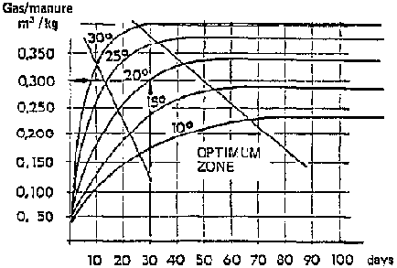 The fermentation time is an important factor in determining the size of the biogas plant and epends on the temperature in the digester. The fermentation period is defined as the time taken for material to flow through the plant from input to output. The following guide values apply to the regions stated: