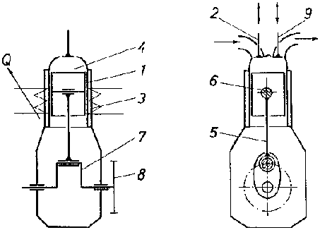 rod, 6 gudgeon pin, 7 crankshaft, 8 flywheel, Q head rejected (cooling).
