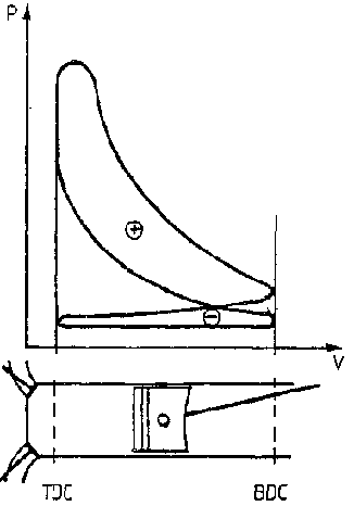 The area marked (+) in the diagram shows the work transmitted from the burning and expanding air/fuel mixture to the piston. The area marked (-) is the work that the piston delivers while expelling the burnt flue gas and sucking in fresh air or air/fuel mixture The process is often shown without the negative work in an idealized form.