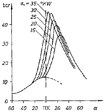 In a diesel engine the air/fuel mixture is prepared within the cylinder by the injection of a certain amount of diesel fuel into the air during its compression by the piston. The spray droplets ignite immediately when they come into contact with the hot air. The point or crank angle £i of ignition is almost identical with the crank angle of injection, usually around 25° before TDC (Fig. 3.9).