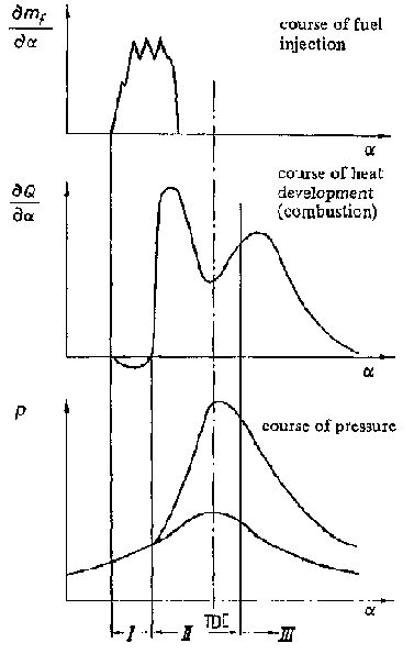 In the first phase (I) injection of fuel begins but some time is needed for part of the fuel to evaporate and form a combustible air/fuel mixture. In the second phase (II) the fuel begins to ignite while the injection still continues. The start of combustion results in a sharp increase in heat and pressure. In the third phase (III) the combustion of the more slowly combusting parts, mainly the carbon components, takes place.