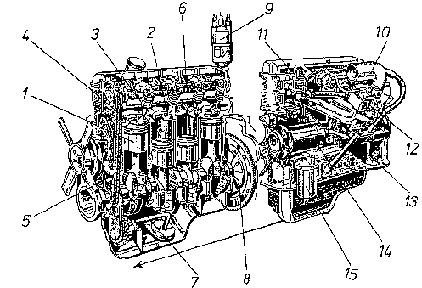 1 piston, 2 inlet valve, 3 cylinder, 4 combustion chamber, 5 connection rod, 6 injector nozzle, 7 suction mainfold, 8 oil filter, 9 outlet valve, 10 injector pump, 11 alternator,12 fuel filter, 13 cooling water pump.