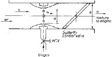 - Another alternative is the modification of the carburetor itself to act as a venturi gas mixer. This can be achieved by replacing the original carburetor venturi by a new one for biogas which has been designed and dimensioned according to the procedure in the previous chapter. A hole will have to be drilled into the carburetor body at a suitable place to insert the biogas supply pipe in such a way that it meets the internal ring channel of the venturi ring. The biogas supply pipe or a short tube for connection to a flexible hose pipe will have to be threaded if the carburetor body's wall thickness allows for screwing in. Otherwise a two-component epoxy resin glue can serve the purpose unless aluminum welding facilities are available.