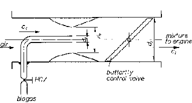The cross-sectional dimension of the venturi mixer should be equal to that of the manifold. The intake velocity ci almost equals the velocity ci of the air coming from the air filter when the throttle is fully opened. In a controlled position the velocity before the butterfly valve (in flow direction) is reduced. The dimensioning of the inlets for fuel gas, however, needs to consider the fuel requirement at unthrottled operation for maximum performance, i.e. at maximum intake.