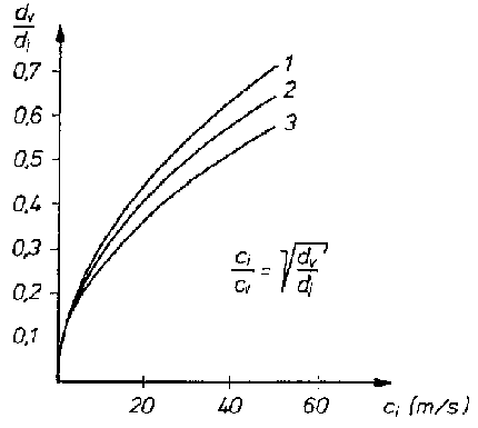 As s rule; of thumb and for first calculations the diameter ratio for a venturi may range at dv/di = 0.67 which would result in a velocity ratio of cv/ci = 2.25, e.g. a velocity increase from ci = 50 m/s to cv = 112.5 m/s. Fig. 6.5 gives the relation between the diameter ratio and the velocity increase to some selected velocities at the venturi bottleneck.