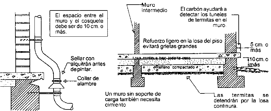 Una losa de piso de concreto reforzado continua debajo de toda la edificación es efectiva para mantener alejadas a las termitas subterráneas. Si se necesitan juntas, estas deben ser ásperas y con pendiente o lengüeta y juntas ranuradas.