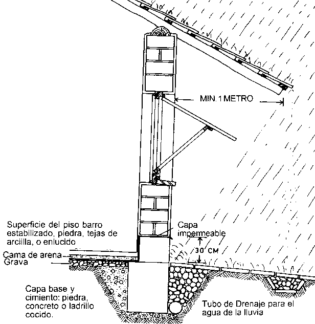 Para proteger los muros exteriores y sus aberturas se requiere de techos con grandes aleros, que descargan el agua de la lluvia lo suficientemente alejada de la base de los muros, evitando que éstas se ensucien y erosionen por efecto del agua que cae.
