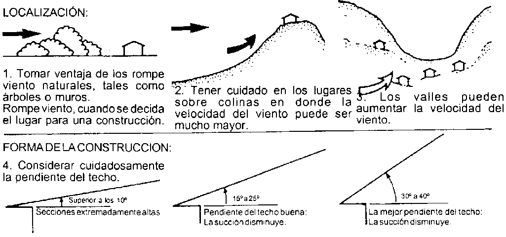 Las edificaciones deben ser ubicadas preferentemente en zonas altas, suficientemente alejadas de la orilla del mar, y se debe observar que la topografía o edificaciones circundantes no causen un efecto de túnel, que incrementaría la velocidad del viento. Grupos de árboles actúan como rompe vientos naturales.