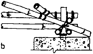Unión 2: la barra diagonal se apoya sobre pinas insertados a través de la barra superior, por lo cual los pinas soportan ambas, la correa y la barra diagonal. Una elemento intermedio (una especie de arandela) aumenta considerablemente la resistencia.