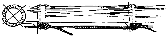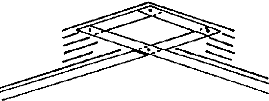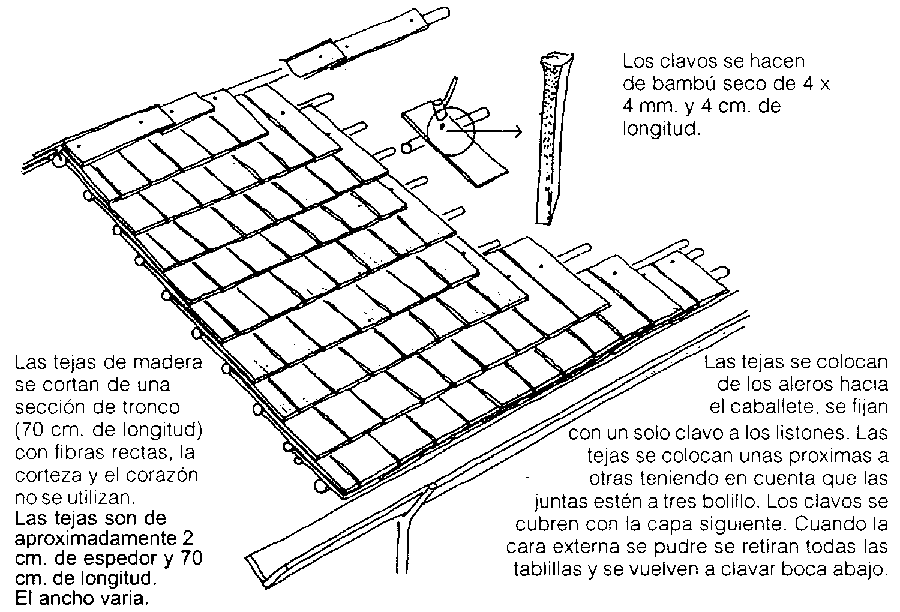 En el caballete se atan dos tejas y se cuelgan a ambos lados. El hueco del caballete se cubre con la mitad de una caña de bambú (la caña se corta por el centro de la sección)