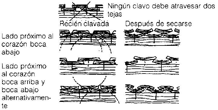 Las tejas de madera se clavan a los listones, se debe tomar en cuenta el posible arqueo de la misma después de secarse.
