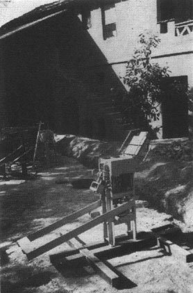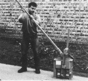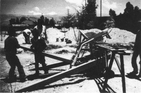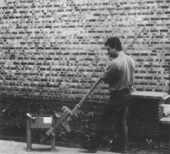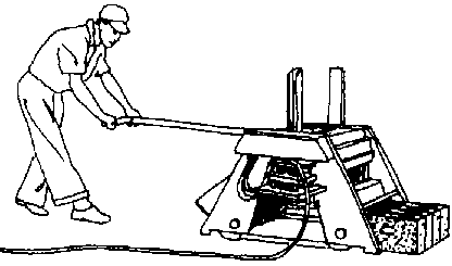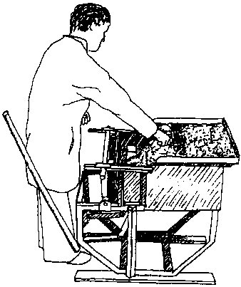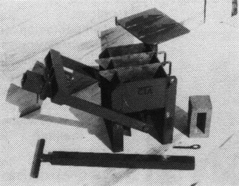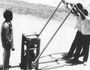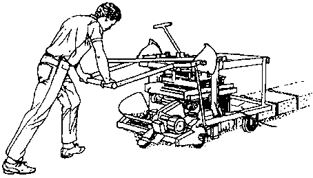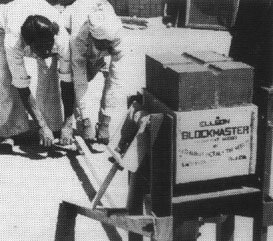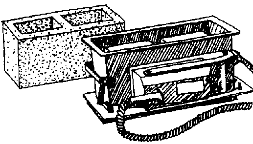 Molde simple para bloques, equipado con una bandeja para preparar la mezcla de cemento-arena. El molde lleno es apisonado manualmente y la superficie superior alisada con una llana. La palanca es empleada para hacer descender la caja y el bloque hueco es volcado sobre un tablero de madera, listo para el curado.