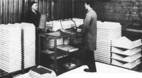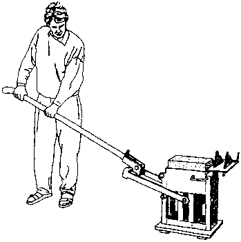La máquina, operada por 3 personas, requiere una fuerza de 30 kg. sobre el brazo de la palanca y aplica una fuerza de 800 kg. sobre la teja fresca. Se disponen de dos moldes de modo que un molde pueda ser desmoldado y llenado mientras el otro está siendo comprimido. Producción: 70-85 tejas por hora.