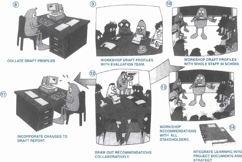 In 1994, when LCD first began conducting baseline surveys of the inservice training programmes which they facilitated, they used the data they obtained primarily for providing benchmarks against which future change could be assessed. There was a need to assess the impact of their programmes both for the participants themselves and for funding agencies who required proof that resources were being effectively utilised. With experience, LCD has recognised the value of participatory baseline surveys as developmental processes in themselves. This paper begins by outlining how a baseline study can serve as a catalyst for change.1 In these instances, baseline studies are intended to show where there may still be room for improvement. (See cartoon drawings in section 3 for a depiction of the process.)