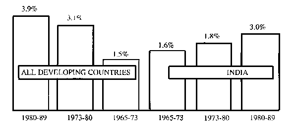 When compared to 130 other countries, India ranks second in terms of population size, 103 in terms of GNP, 81 in adult literacy, 95 in terms of infant mortality, 84 in terms of life expectancy. India's average annual rate of increase in real per capita GNP has been even lower than that of other developing countries (see Table 1)1. Yet there are paradoxes. India has one of the largest forces of trained and technically qualified manpower in the world. Welcome or not, its people participate in major industrial, scientific and other ventures in a large number of places around the world. Its people are found to learn and teach in almost every major university and institute across the globe. And despite the incredible social, cultural and political complexities which bedevil it, India still continues to function, even if sometimes in an anarchic manner.