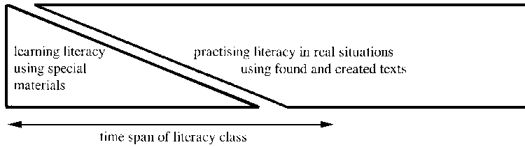 While we agree that teaching of literacy skills is necessary, we would wish to insist that this should not consist of a traditional teaching programme brought over as a whole and inserted into a programme designed to encourage the use of literacy skills. It is not possible simply to 'drag' the old model over and 'drop it into' the new model. For this will mean that the learning programme will be largely unchanged - and therefore as ineffective as it has been in the past in promoting the use of literacy skills. Nor can we simply drop the new model into or append it onto the end of the old model. That too will not work.