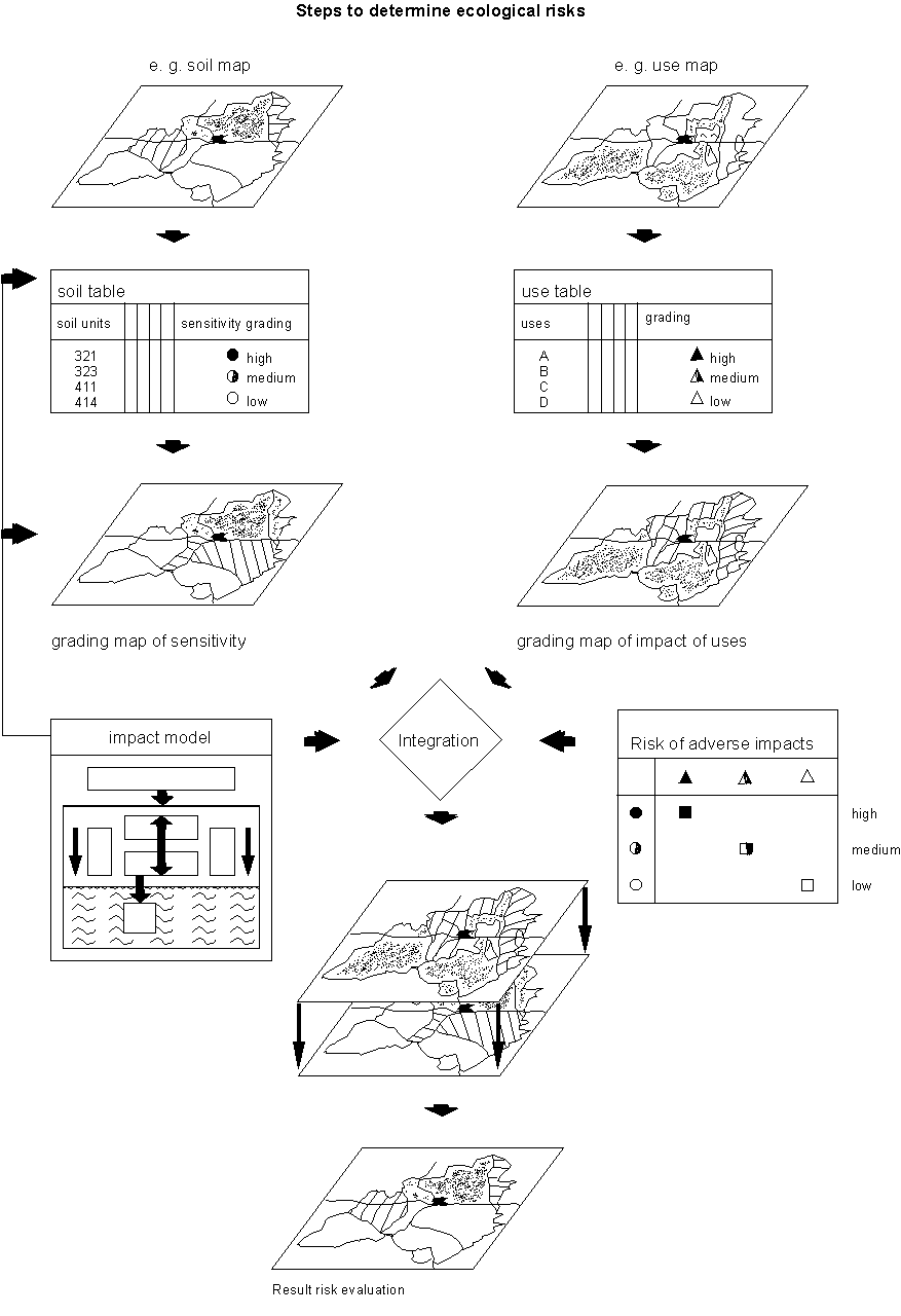 The following summary lists possible questions arising at the level of integrated area planning as elements of an ecological risk analysis. These must be tailored to each individual case, above all in terms of their weighting (relevance); the order in which they are listed is not necessarily indicative of the working procedure, indeed, analysis of the suitability and sensitivity characteristics of the natural resources and analysis of the usage pattern affecting these as a result of interactive relationships often overlap.
