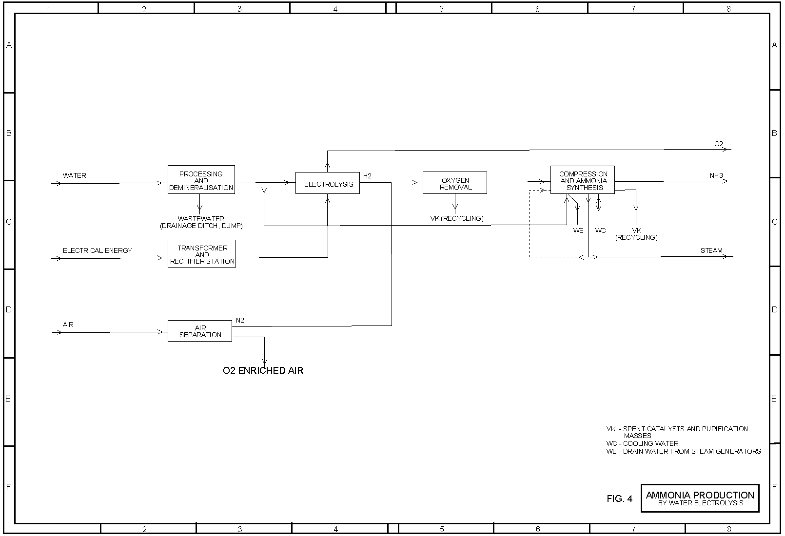 The feed product is fully demineralised water; this is produced in ion exchangers and mixed bed filters. Water electrolysis consumes a great deal of power and is thus an option only where cheap excess energy is available or where other raw materials are in short supply. The nitrogen required for NH3 synthesis is obtained by air separation. In electrolysis, very pure oxygen, suitable for a large number of technical applications, is formed, whereas in air separation only an oxygen-enriched spent air flow is generated which is normally released into the atmosphere.