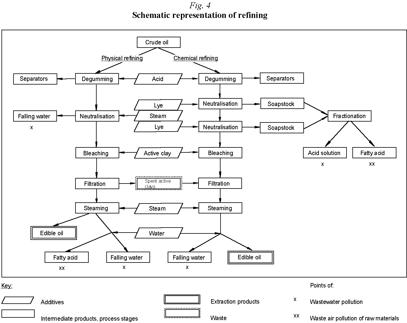 The oils produced by extraction must - for reasons of durability, taste, appearance and consistency - be cleared of impurities such as free fatty acids, particles of dirt and seed, lecithin, carbohydrates, fats, gummy or mucilaginous substances, pigments, waxes and oxidation products. The purpose of refining is to remove undesirable by-products whilst retaining desirable ones, e.g. vitamins, antioxidants (tocopherols) or certain technical properties. Refining comprises basically the degumming, neutralisation, bleaching and deodorisation of the crude oil, and it is in these processes that most of the wastewater and unpleasant odours are produced. The lyes and acids used in the process bring with them a potential risk of injury to personnel (safety measures and training necessary). Figure 4 illustrates the refining process schematically.