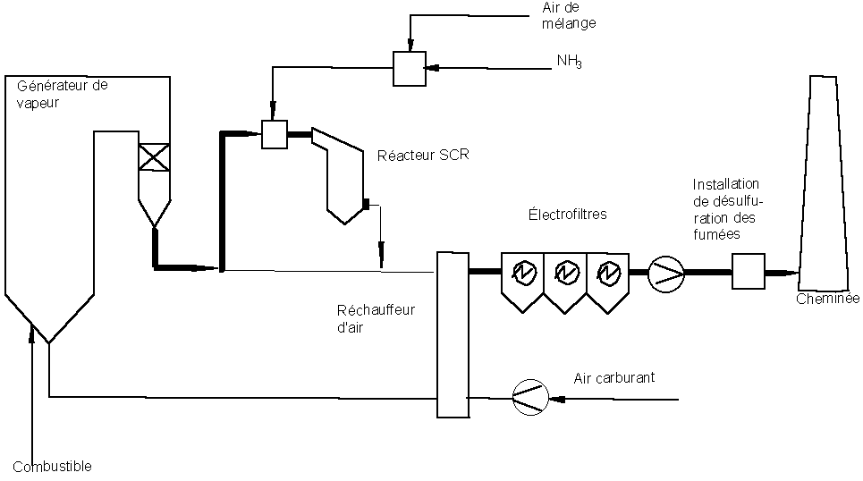 En ce qui concerne les émissions de poussières et de SOx, on dispose de techniques ayant fait leurs preuves à l'échelle industrielle et qui peuvent contribuer à réduire notablement les rejets. Etant donné que dans de nombreux pays, on utilise la plupart du temps, pour des motifs économiques, des charbons d'origine locale ayant des fortes teneurs en stériles et en soufre, il convient d'accorder la plus grande attention à la réduction de ces substances polluantes. Selon la situation locale et les données d'ensemble, on devrait s'efforcer de ramener les émissions à des valeurs inférieures à 150 mg/m³ (c. n.) de poussières et à 400 mg/m³ de SO2. Pour la limitation des émissions de NOx, on devrait dès la phase d'étude du projet prévoir des mesures appropriées pour obtenir une combustion produisant peu de NOx. Grâce à ces mesures primaires, il est possible de limiter les émissions de NOx à des valeurs allant de 200 à 600 mg/m³ (c. n.) (sans foyer à cendres fondues) selon la nature du combustible.