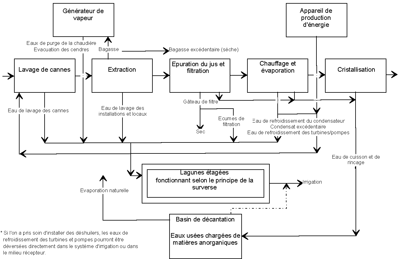 Chacune des opérations entrant dans la fabrication du sucre exige des quantités plus ou moins importantes d'eau. Les besoins en eau du processus d'extraction d'une sucrerie betteravière se chiffrent à 20 m³/t de betterave. Il est possible de réduire cet apport d'eau à 0,5 m³/t en ayant recours à des circuits fermés d'eau. Par ailleurs, il est indiqué de prévoir des circuits séparés pour les eaux très polluées (eaux de transport, de nettoyage, de régénération, eau de précipitation) et les eaux peu polluées (eaux de refroidissement des turbines et des pompes, eau de barrage, eau de lavage de gaz, excédent d'eau de condensation) car l'eau peu polluée (en Allemagne < 60 mgl DCO ou 30 mg/l DBO5) peut alors être déversée dans un cours d'eau. Dans une sucrerie bien gérée, il est possible de réduire le volume des eaux usées très polluées à 0,2 m³/t de betterave ; il faut veiller à ce qu'il ne dépasse pas 0,5 m³/t car dans ce cas les frais d'épuration des eaux usées font que la production n'est plus rentable. La pollution de l'eau augmente tout au long de la campagne sucrière et finit par atteindre des DCO de 6 500 mg/l et des DBO5 de 4 000 mg/l et plus. Les usines traitant la canne à sucre génèrent d'importantes quantités d'eau de lavage (jusqu'à 10 m³/t) et de condensat mixte (eau de précipitation) issu de la condensation des vapeurs et du raffinage du sucre brut. Ces eaux doivent circuler en circuit fermé (besoins importants de terrain en cas de bassins d'aération, investissements élevés en cas de tours de refroidissement). On constate une forte pollution de l'eau de lavage de la canne (260 à 700 mg/l DBO5), des résidus de filtration (2 500 à 10 000 mg/l DBO5), de l'eau de nettoyage du charbon animal et des résines d'échangeur d'ions dans les raffineries (750 à 1 200 mg/l DBO5). Les eaux de nettoyage comprennent aussi les eaux usées ayant servi au lavage des locaux et installations de fabrication pendant et après la campagne sucrière, de même qu'au nettoyage des véhicules de transport du sucre. Les jus et eaux qui s'échappent en cas d'incident de fonctionnement (le jus clair a p. ex. une DBO5 d'env. 80 000 mg/l) viennent s'y ajouter, de sorte que l'on peut avoir des valeurs de jusqu'à 18 000 mg DBO5/l. Les négligences sont la principale cause de pollution excessive des eaux usées. Si l'entreprise est bien gérée, il est possible d'éviter que ces eaux usées atteignent des valeurs de plus de 5 000 mg DBO5/l. Pour réduire la charge organique en même temps que les pertes de sucre dans le condensat mixte (30 à 150 mg/l), il faut impérativement prévoir des séparateurs sur les conduites d'évacuation des vapeurs.