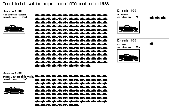 Es indiscutible que la contribución de los países en desarrollo al "efecto invernadero" sigue siendo reducida en comparación con los países industrializados. Sin embargo, los resultados de un estudio comparativo realizado por el Instituto Worldwatch sobre los niveles de motorización de los estados occidentales industrializados y los países en desarrollo, referidos al año 1986 (véase fig.1), muestran claramente las consecuencias que tendría un fuerte aumento de la circulación de vehículos, aun sin llegar a alcanzar el nivel de motorización de los países industrializados. Los efectos globales sobre el clima (y sobre el consumo de petróleo) alcanzarían niveles intolerables. Este hecho pone en evidencia la imposibilidad de trasladar la situación vial de los países industrializados a otras regiones, pero significa además, que los países industrializados deben limitar el tráfico individual a fin de que los países en desarrollo dispongan de margen suficiente para progresar en su nivel de bienestar, sin que ello suponga una amenaza para el clima y el suministro de petróleo a escala mundial.