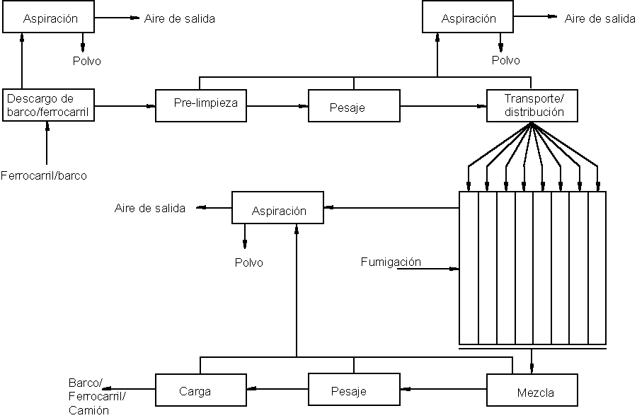Todas las medidas de protección expuestas para el almacenamiento de cereales son también de total aplicación para la molienda de los cereales. Si hay sistemas de silos comunicados por construcciones con los molinos, además de instalar compuertas automáticas contra incendios en los elementos de transporte comunicantes, tendrán que construirse también tabiques ignífugos entre las instalaciones.156 Para la depuración de las aguas residuales de las máquinas de lavado se preverá una pileta de decantación para materias orgánicas (cascarilla, partes de tallos, partículas desprendidas por abrasión, etc.).
