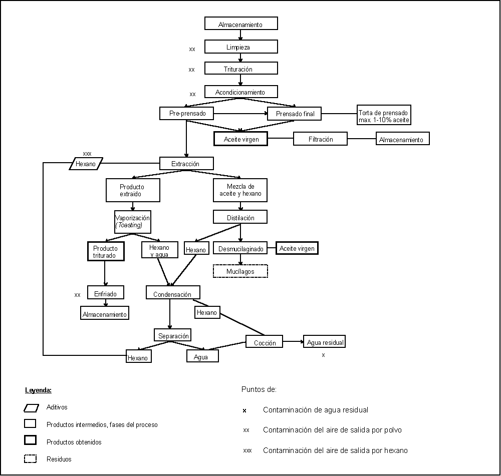 El disolvente más utilizado es el hexano (C6H14)169, que debe considerarse un veneno para el sistema nervioso y para el medio ambiente. Por lo tanto, los residuos de producción contaminados por hexano tienen que purificarse y/o eliminarse. Pueden estar contaminados por hexano: el aire, el producto extraído, la mezcla de aceite y disolvente así como el agua.