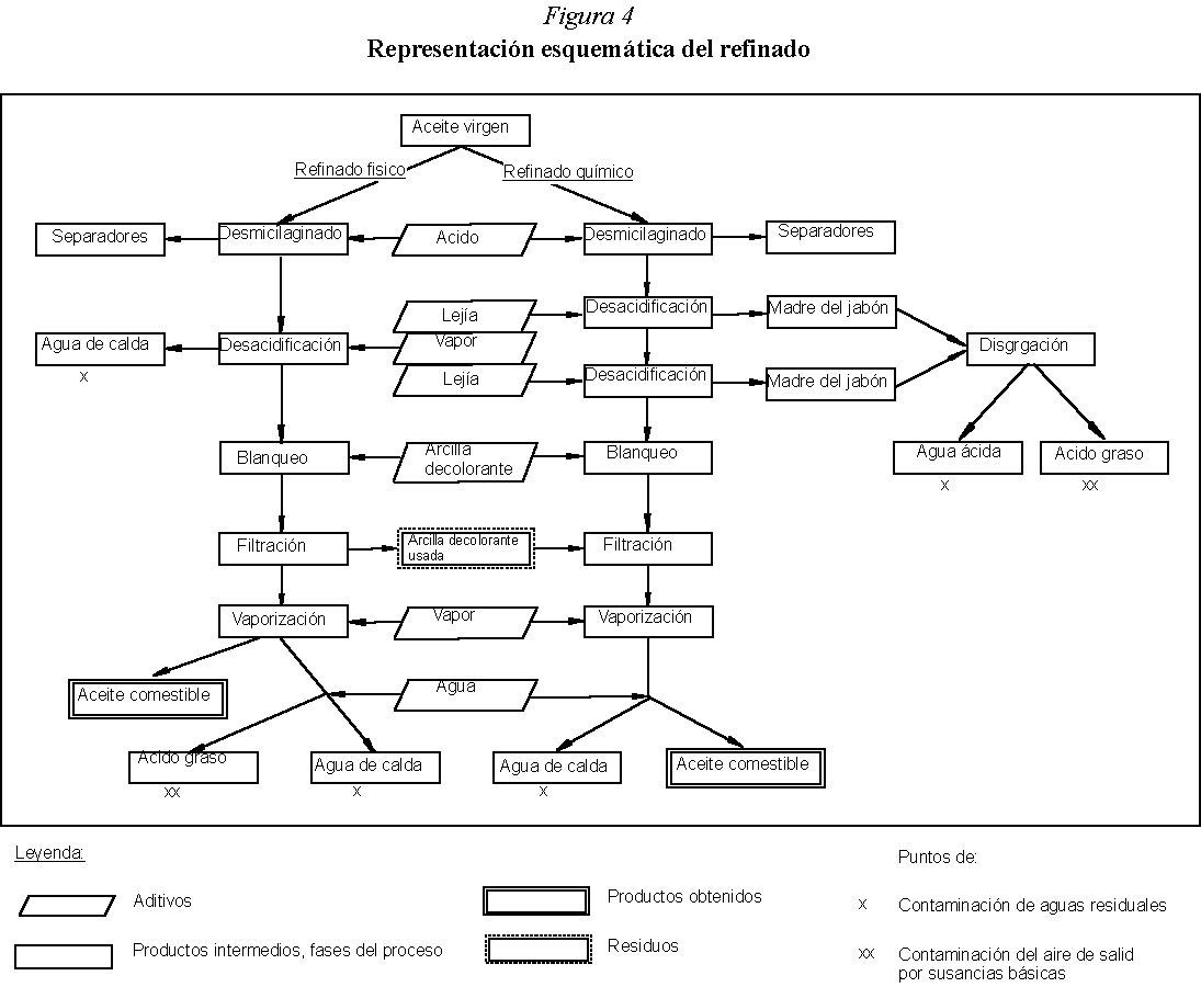 Por razones de conservación, sabor, aspecto y digestibilidad, los aceites obtenidos por extracción tienen que limpiarse de impurezas como son ácidos grasos libres, partículas de suciedad y de semillas, lecitina, hidratos de carbono, grasas, mucílagos, colorantes, ceras y productos de oxidación. El objetivo del refinado es eliminar ingredientes no deseados y conservar otros deseados, p. ej. vitaminas y antioxidantes (tocoferoles), así como determinadas propiedades técnicas. El refinado consta esencialmente en el desmucilaginado, la desacidificación, el blanqueado y la desodorización del aceite virgen. Aquí se originan la mayor parte de las aguas residuales así como sustancias odorantes molestas. Las lejías y los ácidos utilizados durante el proceso representan un riesgo potencial de lesiones para el personal (por lo que se requieren medidas de protección y la debida formación). En la figura 4 se representa esquemáticamente el proceso de refinado.
