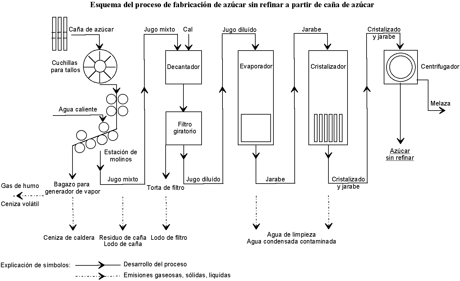 Esquema del proceso de fabricación de azúcar sin refinar a partir de caña de azúcar