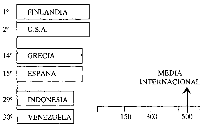 Fig. 2 Posición de alumnos venezolanos de 10 años de edad, en niveles de lectura, entre 30 paises de diversos continentes. Algunas naciones ocupan altos niveles en relación al índice medio de 500, como Finlandia y U. S. A., otros ocupan el nivel medio, como Grecia y España, y Venezuela se sitúa en la última posición después de Indonesia. (De acuerdo a las investigaciones de Elley, W. B., v. Bibliografía).