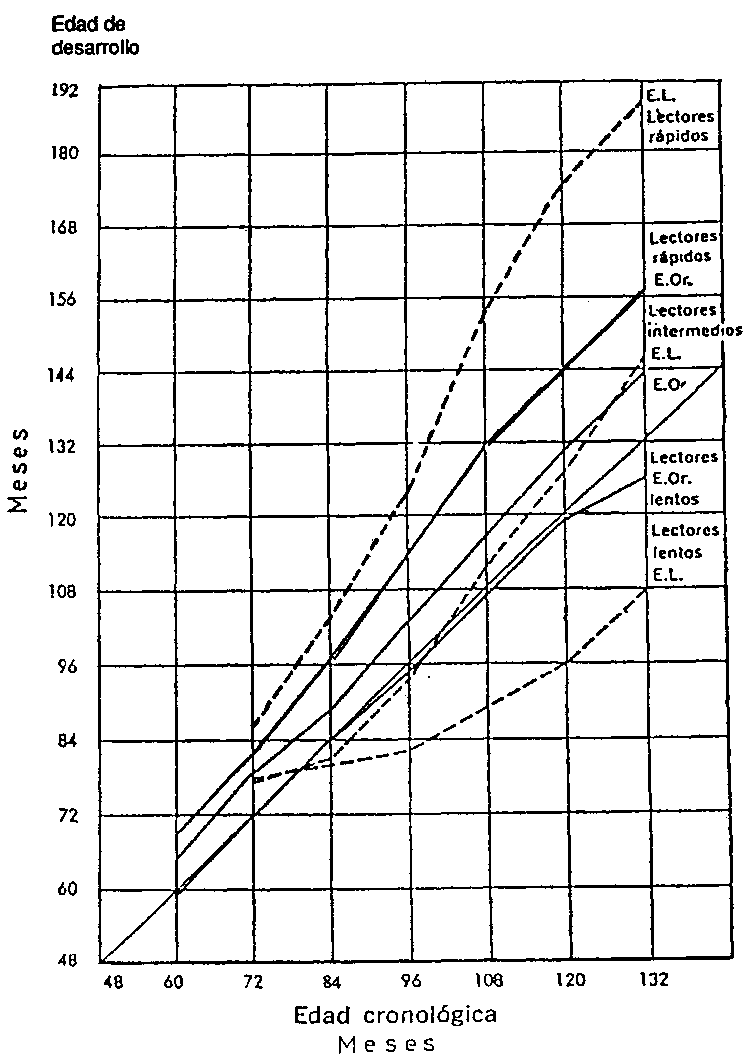 Fig. 6 En la asitencia de las dificultades escolares es de sumo interés conocer los estudios de Beck (v. Bibliografía), quien ha podido establecer grupos normales de lectores rápidos, intermedios y lentos que se correlacionan con iguales posiciones de los parámetros orgánicos (E Or).