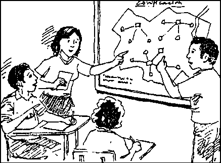 Plumones, tarjetas, cinta masking tape, mesa, sillas, cuadernos, etc.