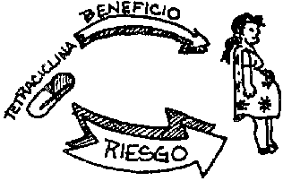b. Una mujer embarazada presenta una infección genital leve y nosotros decidimos recetarle Tetraciclina. Si bien la Tetraciclina puede curar la enfermedad (el beneficio), por otro lado puede producir severos daños en el hijo que ella espera (el riesgo), por lo tanto el riesgo es mayor que el beneficio y no debe usarse.
