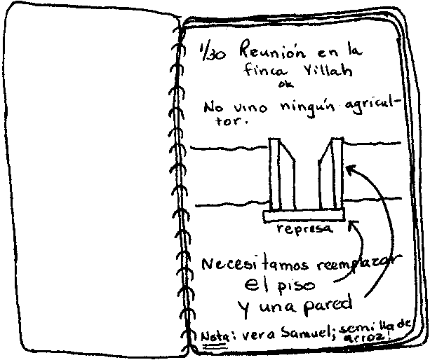 Visité al líder de la asamblea municipal temprano en la mañana para preguntarle sobre la reunión de los agricultores en el pantano Yillah. Me informó que aún se llevaría a cabo. Nadie asistió a la reunión. Aún así, preparé un esquema primitivo de la represa que queremos reparar.