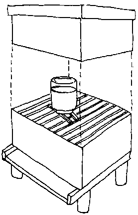 Utilice un alimentador interno para prevenir el robo. Aliméntelas 2-3 veces durante la época de lluvia. Un alimentador interno puede hacerse de un bote, abriéndole pequeños agujeros en la tapa y colocándolo con el jarabe sobre el área de las reservas en la colmena.
