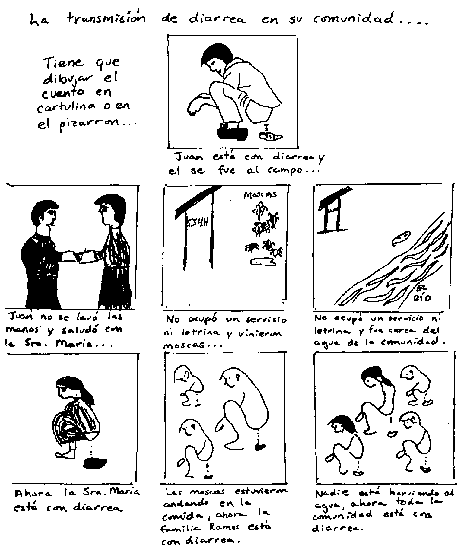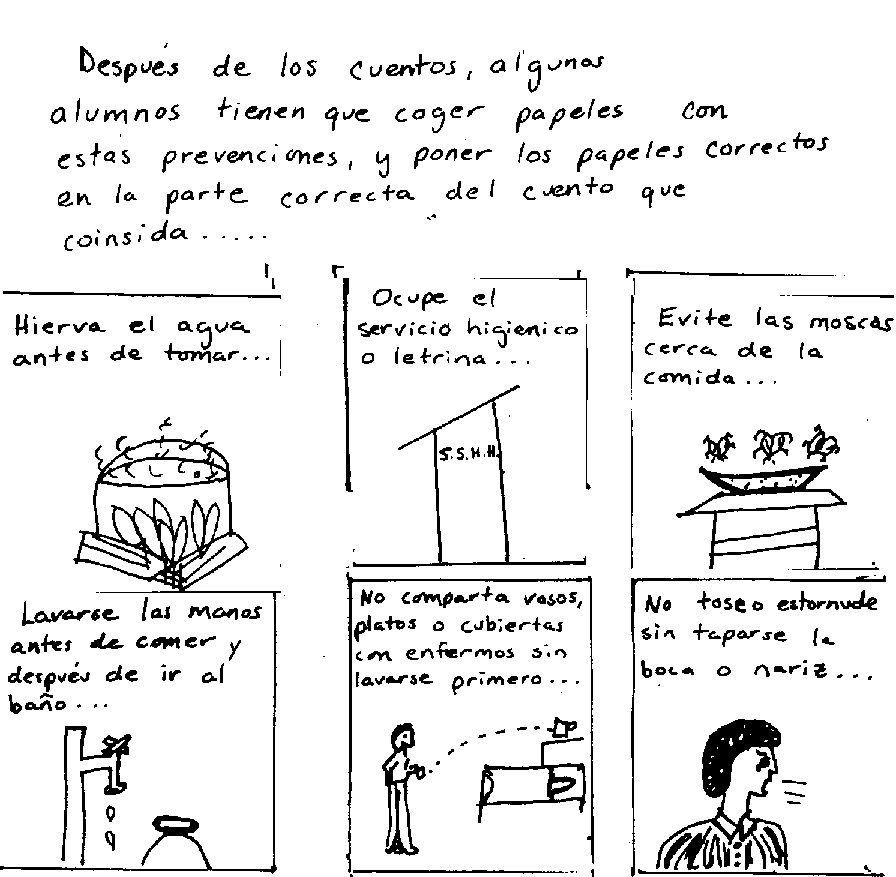 Los cuentos a base de dibujos se pueden usar para explicar la transmisión de enfermedades. Después de los cuentos, los niños tienen que decir como hubieran podido prevenir la enfermedad con los dibujos en la página 22.