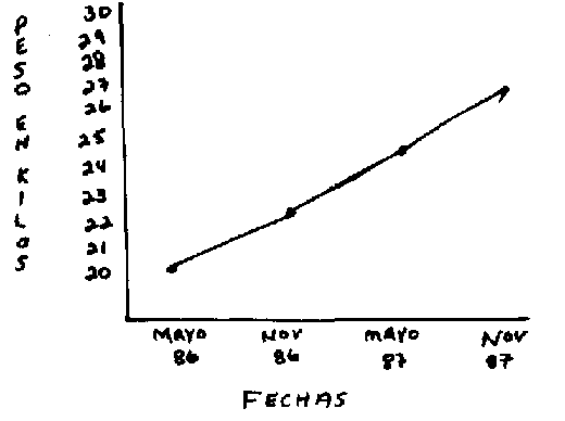 c. Pese cada alumno: Si es posible, conseguir una balanza para pesar cada alumno. hágalo. Anote el peso cada seis meses. Para cada alumno debe hacer una representación gráfica. El peso de cada niño debe subir en una manera así, como en el dibujo. Si un niño está bajando de peso, algo mal está pasando, y debe conseguir ayuda médica.