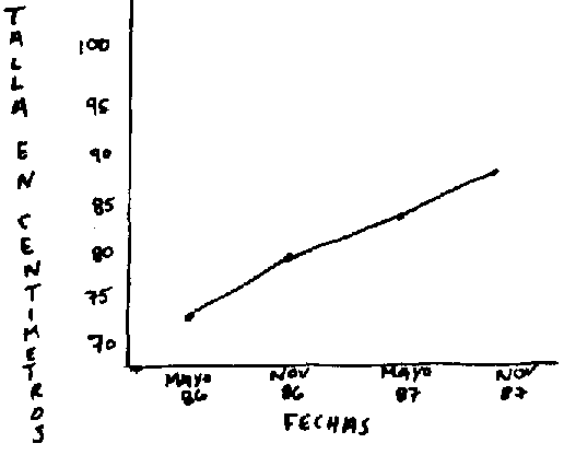 d. Talle cada alumno: Si es posible conseguir una cinta métrica para tallar cada alumno, hágalo. Anote la talla cada seis meses. Para cada alumno debe hacer una representación gráfica. La talla de cada niño debe subir en una manera así, como el dibujo a lado.