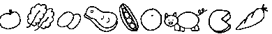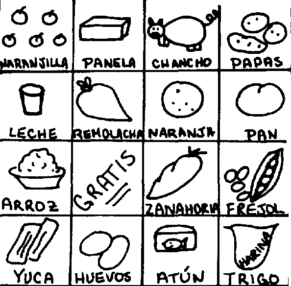 Uno de los juegos que más les gusta a los niños es el Bingo. Se necesitan unas tarjetas - una para cada estudiante - con 16 cuadros. En un cuadro se escribe "GRATIS " y en los otros 15, se dibuja un alimento. A continuación, un ejemplo. Cada tarjeta tiene que ser diferente y tener ejemplos de alimentos de los tres grupos. Como es bastante trabajo hacer las tarjetas, los niños mismos pueden hacerlo. Déles una lista de todas las comidas posibles (vea la ilustración en la próxima página). Ellos pueden dibujar unos 15 alimentos (o solamente escribir el nombre de los alimentos) para llenar su tarjeta. Para este juego, también se necesita algo que los niños puedan usar para marcar sus tarjetas - como fréjoles o habas - .