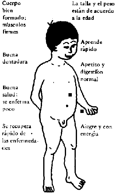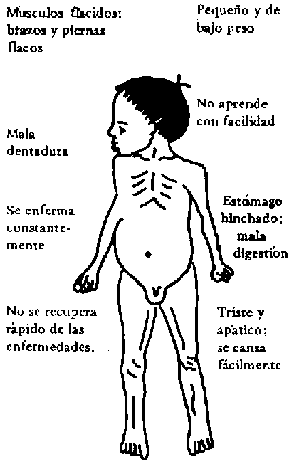 Un niño desnutrido va a estar pequeño y flaco por falta de un crecimiento normal. Va a carecer de energía, lo cual tiene implicaciones para sus actividades físicas y mentales. La vida de un niño es muy activa, especialmente en el campo, donde los pequeños tienen que trabajar y caminar bastante. Al niño desnutrido, le va a faltar la energía para este trabajo físico. Este niño también va a sufrir de fatiga y cansancio en sus clases. No va a tener ganas ni la capacidad para prestar atención y aprender tan rápido como sus compañeros bien nutridos.