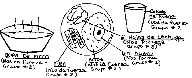 2. Después de enseñar sobre "los grupos de alimentos", haga la siguiente actividad. Cada estudiante tiene que hacer un dibujo de un alimento en una hoja de papel. Luego junten todos los dibujos.