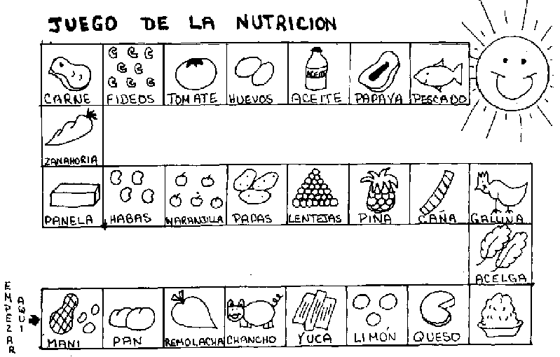 - Los jugadores toman turnos, empezando en la esquina abajo izquierda. Cuando es su turno, el niño toma una tarjeta y la lee. Luego tiene que mover su ficha al próximo cuadro en que esta dibujado un alimento del grupo apropiado. Por ejemplo, si toma una tarjeta que dice "Nos Protege", tiene que mover su ficha al próximo dibujo de una fruta o legumbre. Siguen hasta que un jugador llegue al último cuadro y gana!.