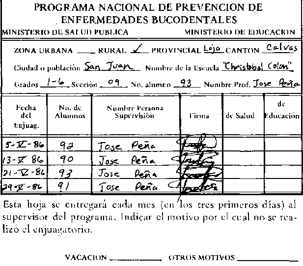 El Flúor es un preventivo contra la caries dental. Hace los dientes más fuertes y resistentes a las caries. Por esta razón, El Ministerio de Salud Pública ha implementado el programa de prevención de enfermedades bucodentales. Este programa consiste en hacer enjuagatorios de flúor semanales en las escuelas del país. El éxito de este programa depende en Usted, el profesor. Hay un doctor encargado del programa que se encuentra en la Dirección Provincial de Salud.