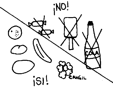 2. Haga todo lo posible por animar a los niños en alimentarse con una dieta adecuada y evitar los dulces. (Algunas actividades para enseñar nutrición se encuentran en el Capítulo No. 4) Desgraciadamente, muchos niños saben chupar helados y caramelos durante el recreo. Peor, unos profesores mismos con los vendedores de los caramelos. Trate de disuadir a los niños del hábito de comer muchos dulces. En vez de comer caramelos, pueden traer una frota o pancito de la casa para comer durante el recreo.