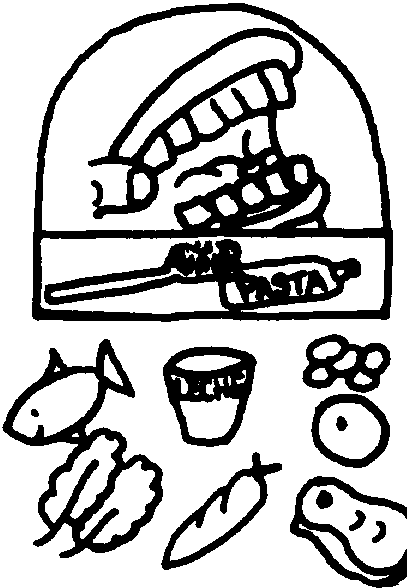 b. Comidas o dibujos de comidas - el mismo número que el número de estudiantes en la clase. La mitad debe ser alimentos nutritivos; la otra mitad golosinas y comidas con mucho azúcar. Por ejemplo, si hay 20 estudiantes en la clase, se necesitan 20 comidas (o dibujos), 10 alimentos buenos para los dientes (frutas, legumbres, carne, arroz, gallina, fréjol, huevos, leche, etc.). y 10 de comidas que dañan los dientes (caramelos, colas, azúcar, caña, galletas, panela, etc.).