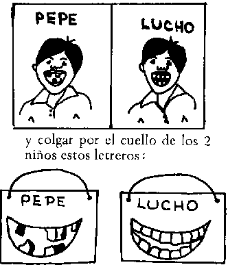 Voy a contarles la historia de dos hermanos Pepe y Lucho. (Ahora, escoja a unos 2 chicos, el uno para representar Pepe y el otro Lucho. Los niños deben ir al frente de la clase). Qué pueden Uds. observar de. estos hermanos? ¿Como son? . . . ¡Idénticos! ¡Igualitos! Son gemelos. Tienen los mismos ojos, pelo igual, boca igual, todo idéntico. . . hasta la ropa igual. A Pepe y Lucho les gusta confundir a su familia y sus amigos. Pero a pesar de que se parecen tanto, hay una manera en que sus amigos y su familia pueden distinguirles. Alguien tiene una idea como? . . . Al hacerles sonreir o escucharles hablar, ellos saben inmediatamente cual es Pepe y cual es Lucho.