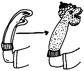 Este tipo de títere es excelente para enseñar dientes, porque se puede hacer mover la boca, abriendo y cerrando la mano. Para hacer el títere más grande, pegue una cara de cartulina a la funda como en Figura B.