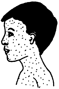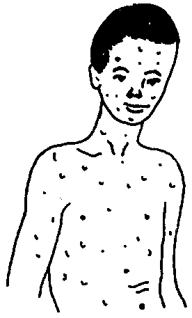 Síntomas: Aparecen granitos colorados con comezón, primero en el cuerpo y después en la cara, los brazos y las piernas. Los granitos cambian a ampollitas que se revientan y forman costras . Hay poca fiebre.